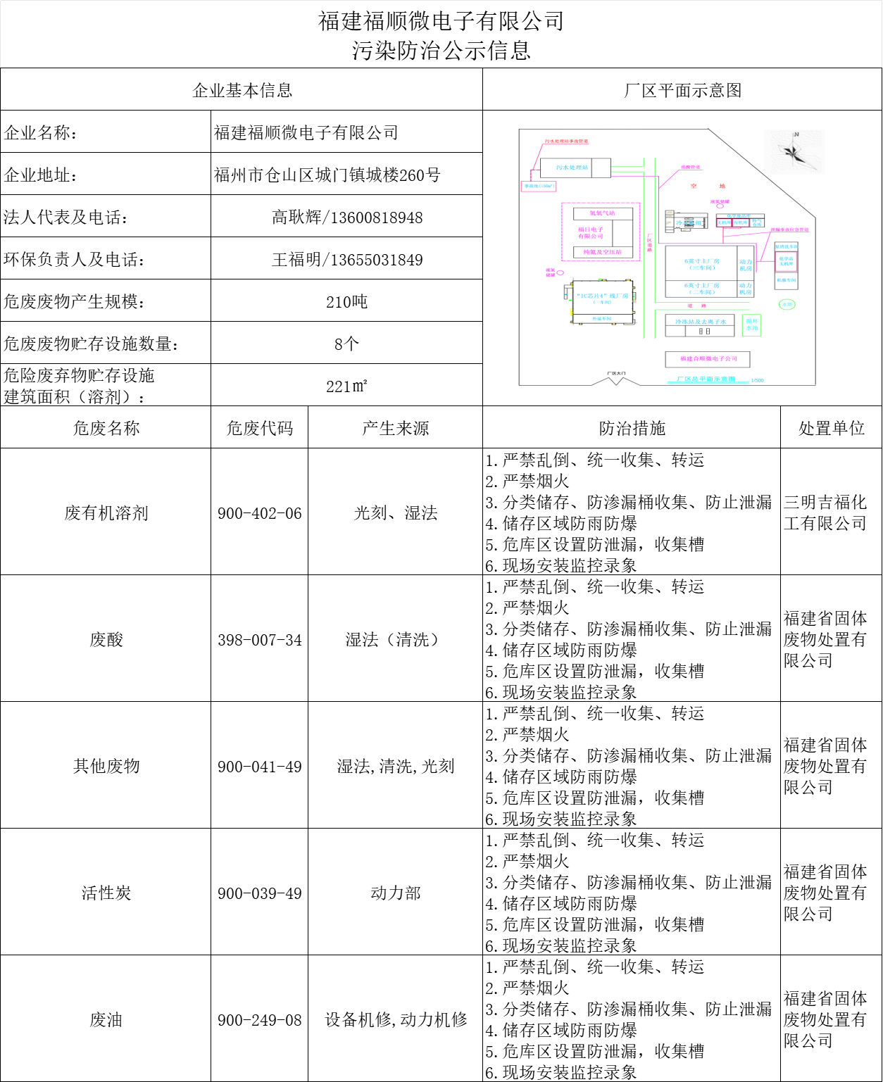 危險廢物接收單位: 福建綠洲固體廢物處置有限公司 福建志坤能源科技開發有限公司 危險廢物轉移運輸單位: 福州省昊辰物流有限公司 危險廢物轉移運輸單位: 福州省昊辰物流有限公司 危險廢物產生及轉移量: